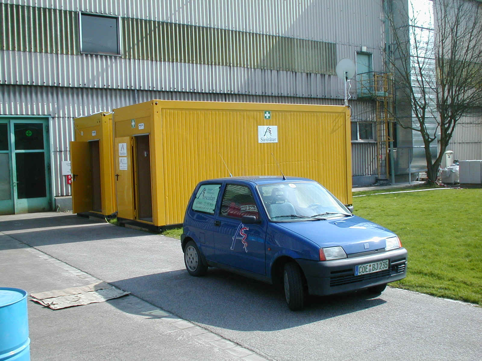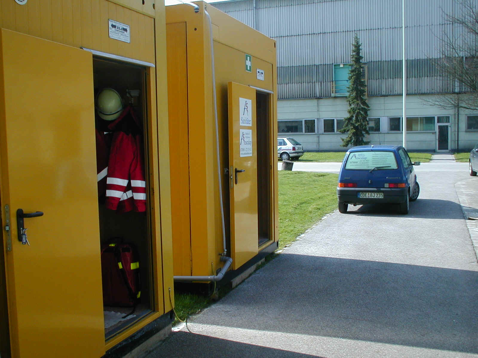 Container. Links der Bereitschaftsraum, rechts der Sanitätscontainer. |
